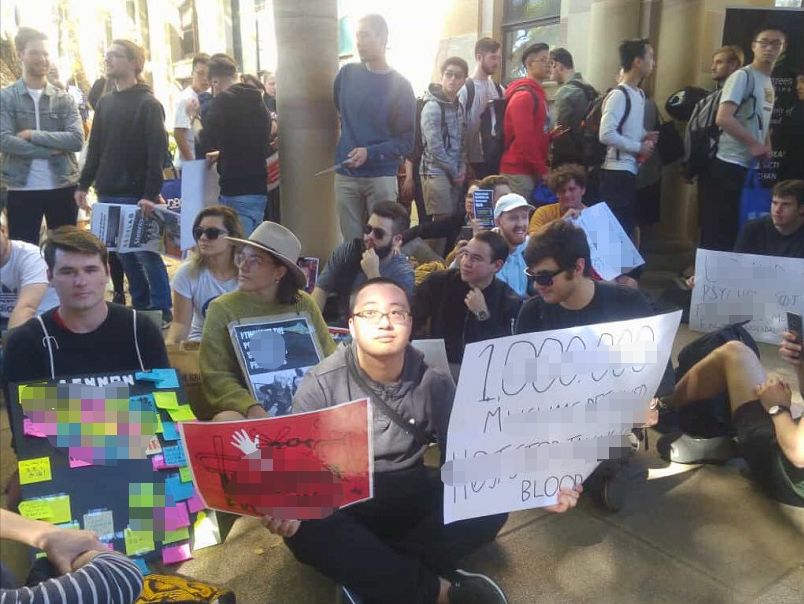 当天上午10点左右,昆士兰大学内,数十位中国香港留学生,手持含有反华内容的标语!开始在校园内静坐。