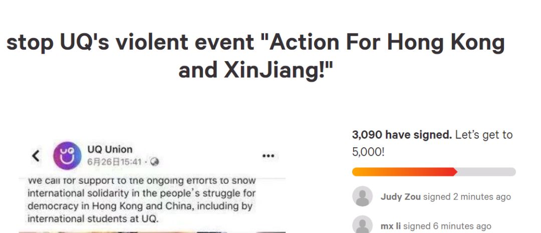 https://www.change.org/p/chinese-overseas-students-stop-uq-s-violent-event-action-for-hong-kong-and-xinjiang