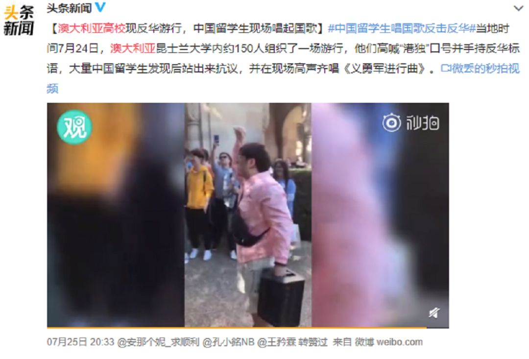 据了解,7月24日下午,极少数别有用心的人在澳大利亚昆士兰大学进行反华分裂活动,引起包括大陆和香港在内的中国留学生的愤慨和抗议。