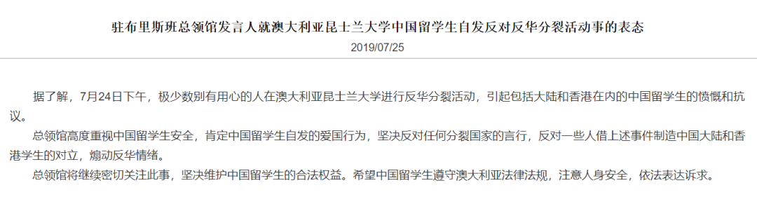 布里斯班总领馆已经发声:肯定留学生的自发爱国行为!