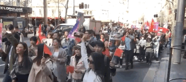 In Melbourne, footage from last night shows pro-Chinese activists chanting “Jiao baba” — which roughly translates to “call us dad”.