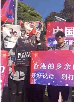 视频显示,中国学生人数众多几乎将示威者包围,并在现场高唱国歌。