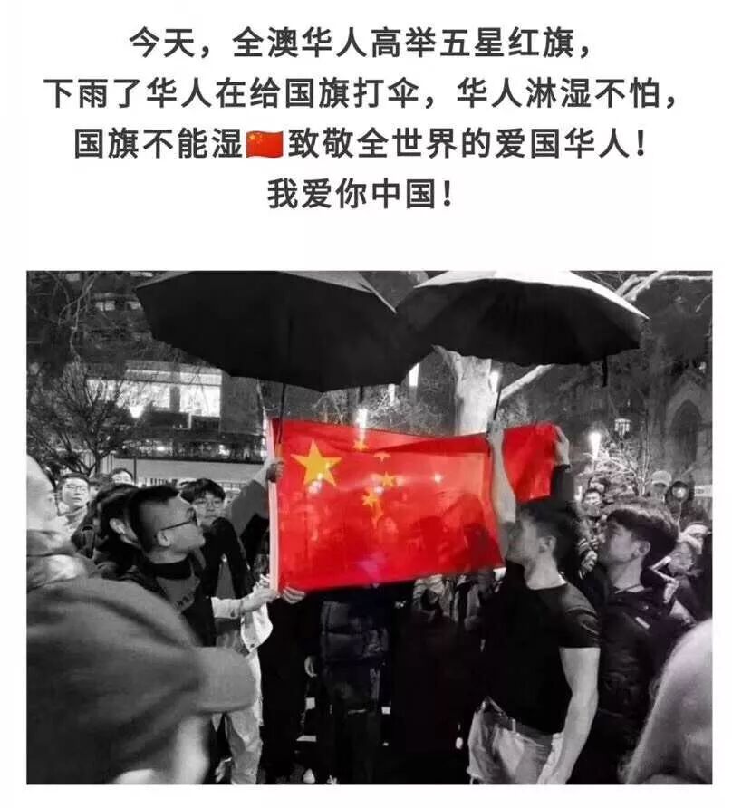 墨尔本示威现场同样热烈。一张为国旗打伞的图点燃了许多华人的爱国热血。