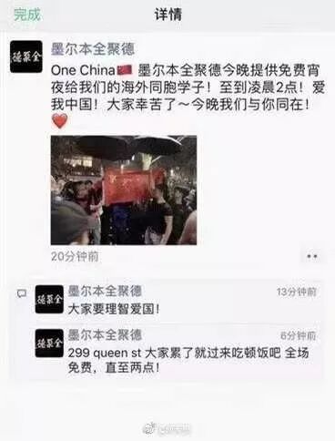 一些爱国商家也在此时表态,为当晚参与反对活动的同胞提供免费的宵夜,直至凌晨2点。