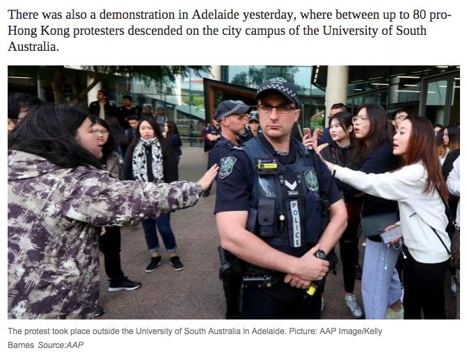 澳媒还写到,当天在南澳大学有80多名香港示威者。