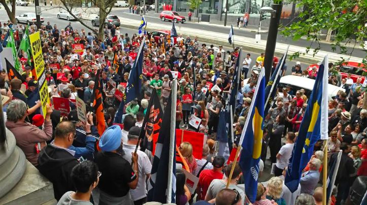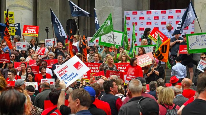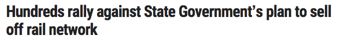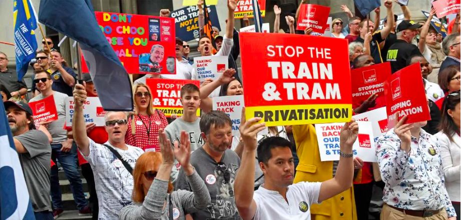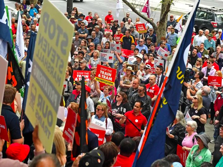 州工党领袖Peter Malinauskas 向人群发表讲话,称铁路服务私有化是“右翼意识形态”。