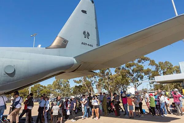 观众在RAAF基地爱丁堡航空展(RAAF Edinburgh Air Show)排队观看C-17A Globemaster飞机
