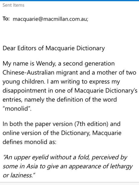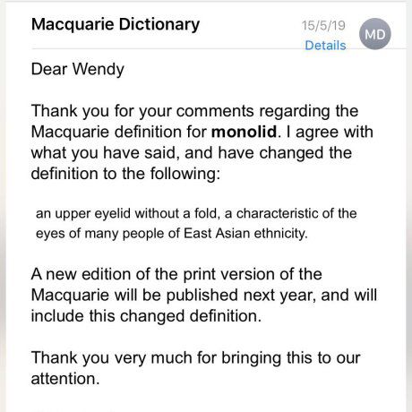 《麦考瑞词典》的总编辑Alison Moore亲自回复了Wendy的邮件,表示同意她对单眼皮定义的观点。