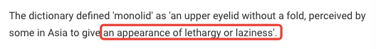单眼皮(monolid)被定义为:An upper eyelid without a fold, perceived by some in Asia to give an appearance of lethargy or laziness