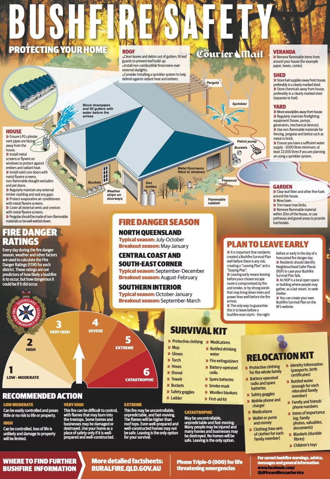 这里,附上昆士兰消防官方有关如何在山火中保护自己以及房屋的传宣海报(南澳州并非传统山火警戒区,所以南澳消防并没有issue类似的海报)。