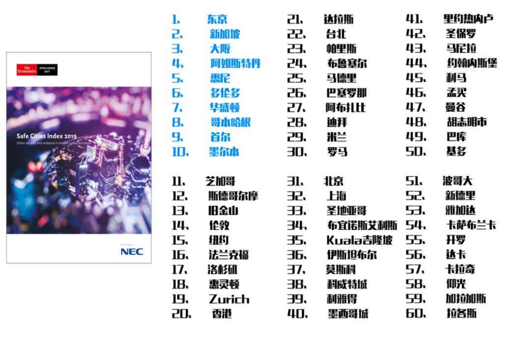 安全城市的指数是对一个城市的犯罪、整体健康、数字和基础设施安全、医院质量、恐怖主义风险、自然灾害和道路交通死伤等因素进行的评比。