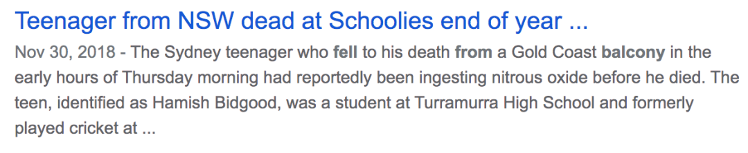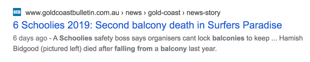 今年已经有两名schoolies在高层阳台外坠楼身亡。