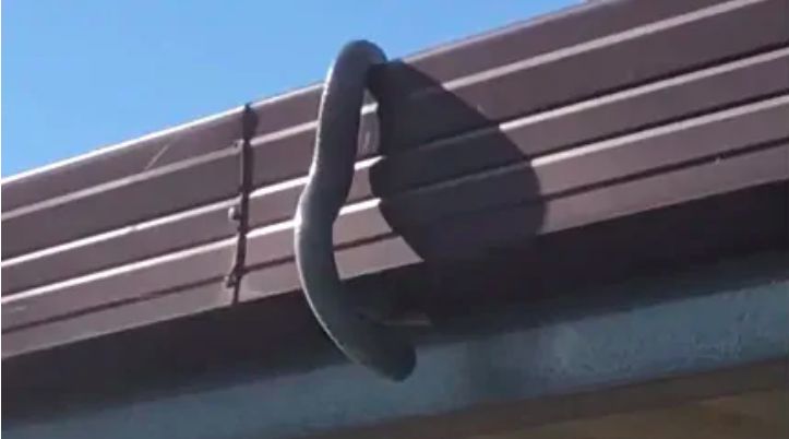 一条棕色的蛇悬挂在一栋住宅的屋顶上