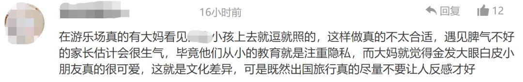 “在游乐场真的有大妈看见小孩上去就逗就照的,这样做真的不太合适,…这就是文化差异,可是既然出国旅行真的尽量不要让人反感才好。”
