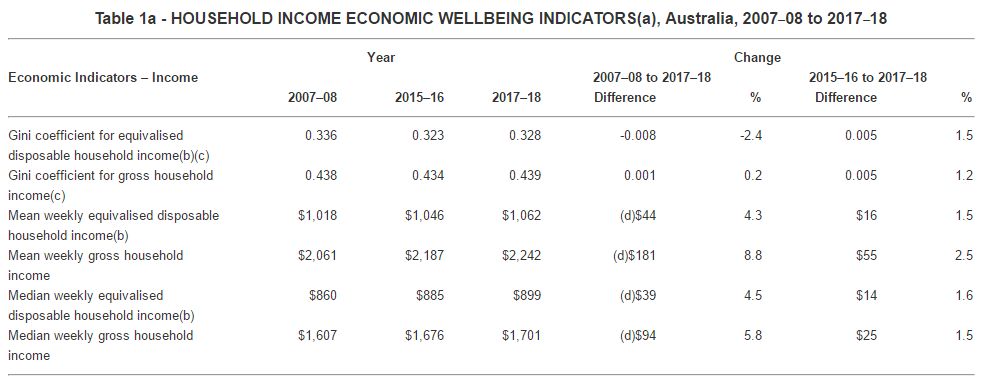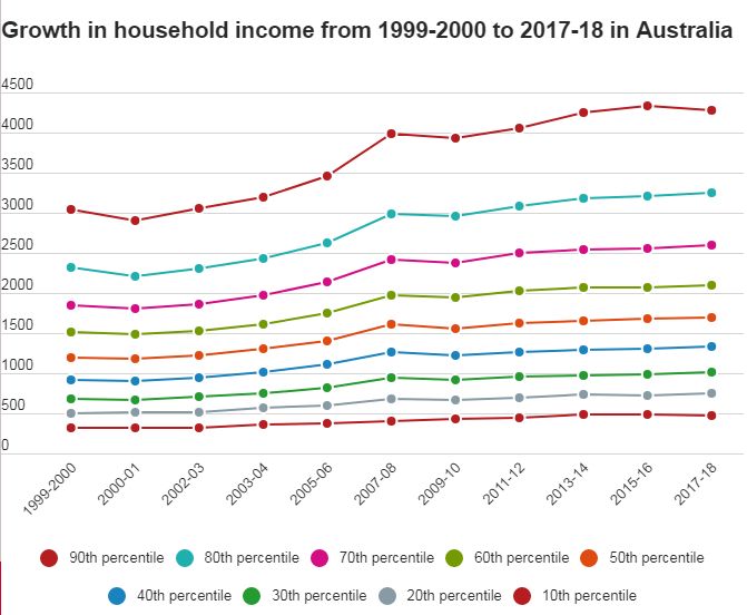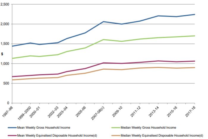 2007-08财年到2017 – 2018财年的十年间,澳洲每周家庭的平均收入只增加了44澳元,达到1062澳元。
