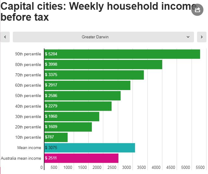 北领地首府城市达尔文的税前家庭中位收入最高,为$3075。