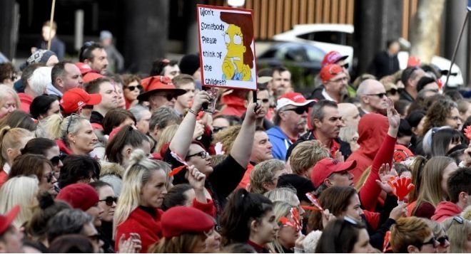 在昨天的调解听证会之后,教师们在阿德莱德议员Rachel Sanderson的选举办公室外集会。