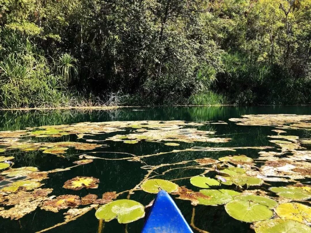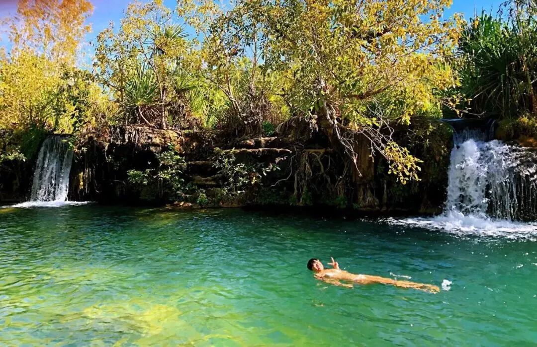 道格拉斯温泉(Douglas Daly Tourist Park):偶然在某营地App上发现了这个地方。上面是免费营地和设施俱全的厕所,下面则是神奇的天然热温泉。我们到达的时候,已经有不少人在水里东倒西歪了。此温泉的神奇之处就在于它真的是“一半是海水一半是火焰”——泡热了就滚到冷的那边降降温,然后再滚回来接着泡,就这么慵懒一下午,旅途的疲倦也就此得以缓解。