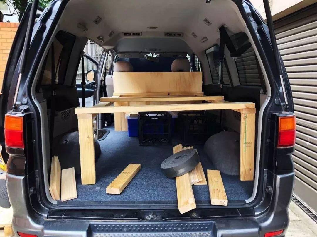 首先在网上买了一辆二手面包车,它的优点如下:能两驱能四驱,价格低廉,结实耐造,还内部宽敞,随后我们把后座全部拆掉,最大化的利用及其有限的空间:下面储物,上面睡觉。
