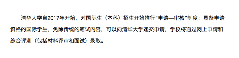 海外留学生们可能对这一点的理解会更加清晰一些,美国、加拿大、澳洲等等绝大部分大学,招录海外留学生都采用的是申请审核制,申请学生按照学校要求提交相应的资料文件,外加语言成绩,就可以了。从国际通行惯例来说,清华免去自己组织的考试,实行申请审核制度,并不算额外的降低了标准,某种程度上来讲,是参考了国际通行做法。