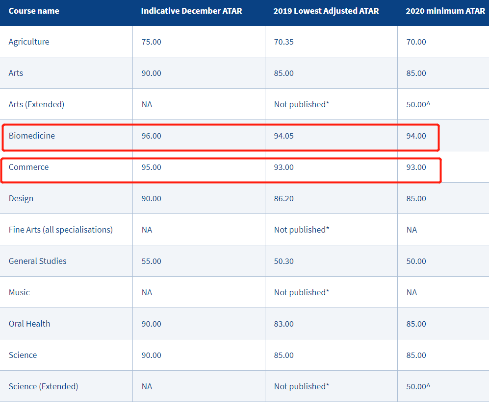 下面以墨尔本大学为例,列举了不同专业的录取分数线。