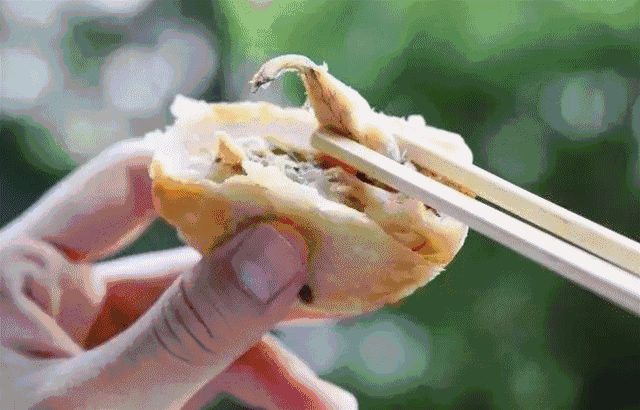 最后就是用手掌将牛舌形的面皮压成圆形,包入肉馅,刷上蛋黄液