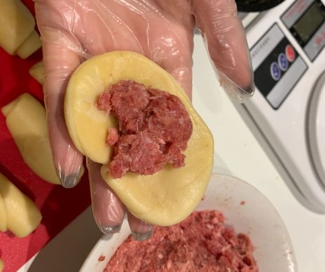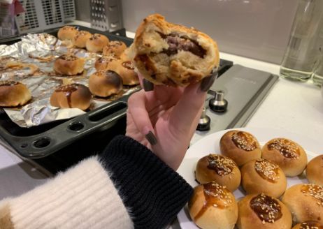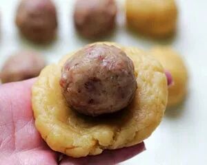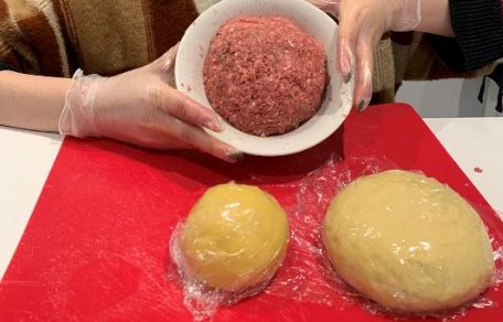 • 用手掌压成圆形,包入肉馅,捏好朝下放入烤盘,刷上蛋黄液;