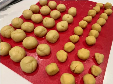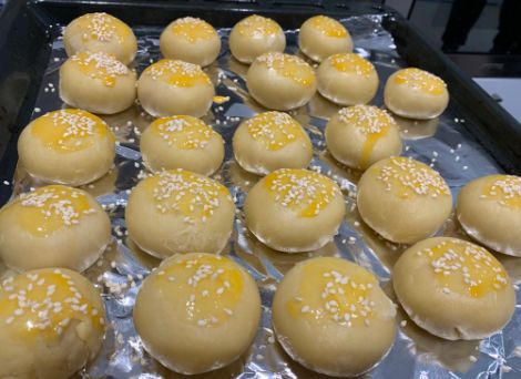 • 醒发好的油皮油酥分成24份,油皮压平包着油酥,用虎口封口朝下摆放;