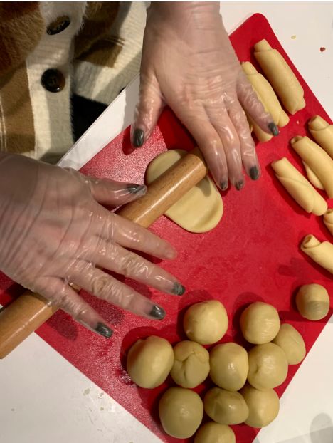 • 擀面杖将每一个面团擀成牛舌形,从一边卷起;