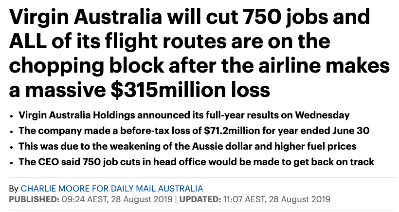 近日,澳洲第二大航空公司维珍航空宣布,今年税后亏损3.15亿澳元,预计将裁员750人。此举再一次验证了土澳的经济低迷!