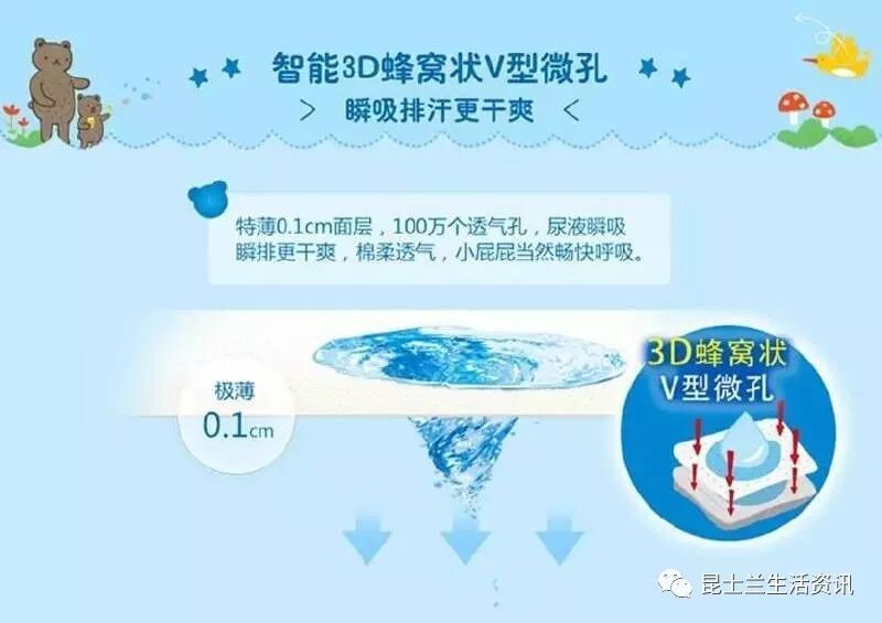挑选纸尿裤可以关注尿裤表面是不是有特别的瞬吸设计,如V型瞬吸孔,S型导流槽,蜂窝网面设计等有助于快速吸收的工艺。