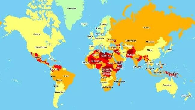 但是旅行的便利和科技的发展也意味着在国外旅行的风险正变得越来越大。一份最新地图突出显示了一些地点,这些地点是世界上最危险的国家所在的位置。