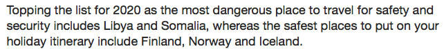 排在2020年“对于安全性而言最危险的旅行地”榜单之首的国家包括利比亚和索马里,而最安全的旅行地则是芬兰、挪威和冰岛。