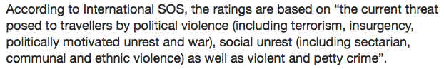 根据International SOS 的数据,这些排名是基于“当前由政治暴力(包括恐怖主义、叛乱、政治动机引起的动荡和战争)、社会动荡(包括宗派、社区和种族暴力)以及暴力和轻微犯罪对旅行者构成的威胁”。