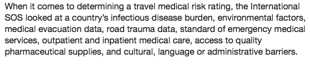 当在确定旅游医疗风险评级时, International SOS公司看的是一个国家的传染病负担、环境因素、医疗疏散数据、道路创伤数据、紧急医疗服务标准、门诊和住院医疗、高质量医药用品的可及性,以及文化、语言和行政壁垒。
