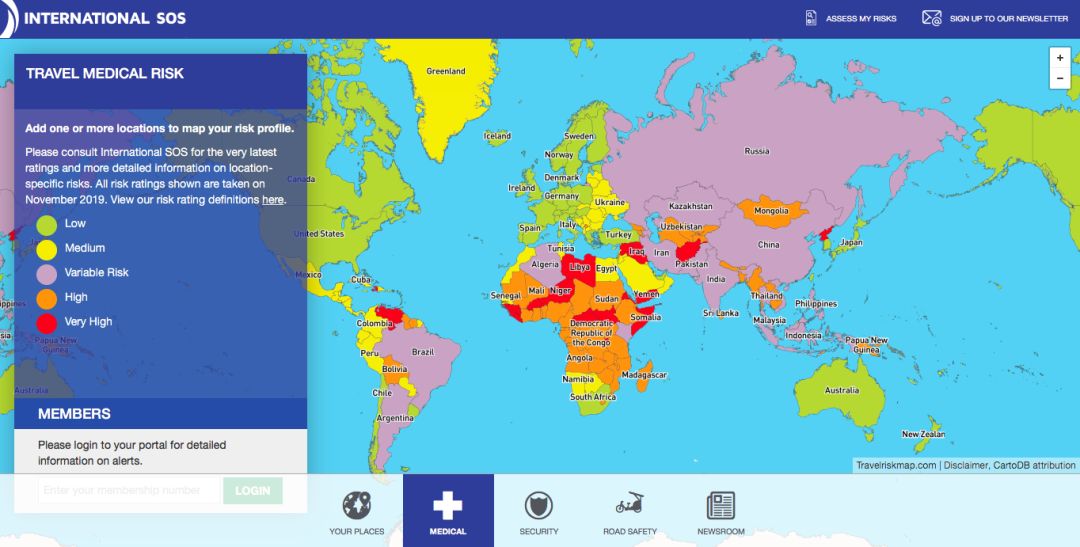 这张交互式的《旅行风险地图》(Travel Risk Map)显示人们在道路安全、安全性和医疗问题上最有可能遇到麻烦的国家所在地。