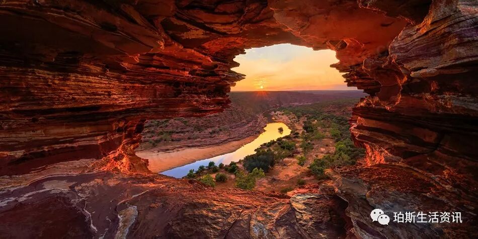 在这里,透过自然形成的窗户,可以欣赏整个峡谷的全境以及莫奇森河(Murchison River)大回环的壮丽景色。在太阳的折射下,赤红的躯体层层表露无遗,壮丽迷人至极。