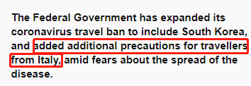 而对疫情同样严重的意大利,澳洲政府并未作出入境限制,只是说