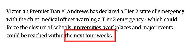 刚刚,维州州长在新闻发布会中表示: 疫情在周二进入了一个新阶段,现在疫情进入”大流行阶段”(Pandemic)的问题是: “何时,而非是否” when, not if 他说:“我们将要求维州人做我们从未要求他们做过的事情。” “该计划的一部分是,不可避免的(在某一阶