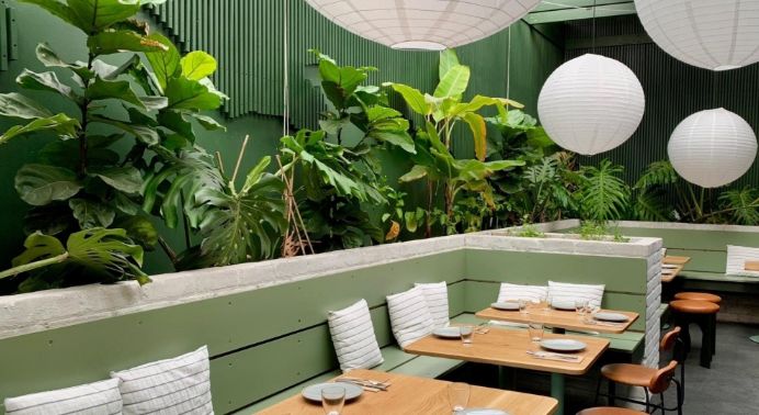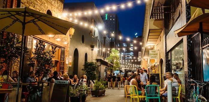 午餐时间来到Pirie St,沿着一条狭窄的通道经过令人印象深刻的长廊酒吧,Oggi可以将您立即带到透着阳光,藤蔓覆盖的广场。