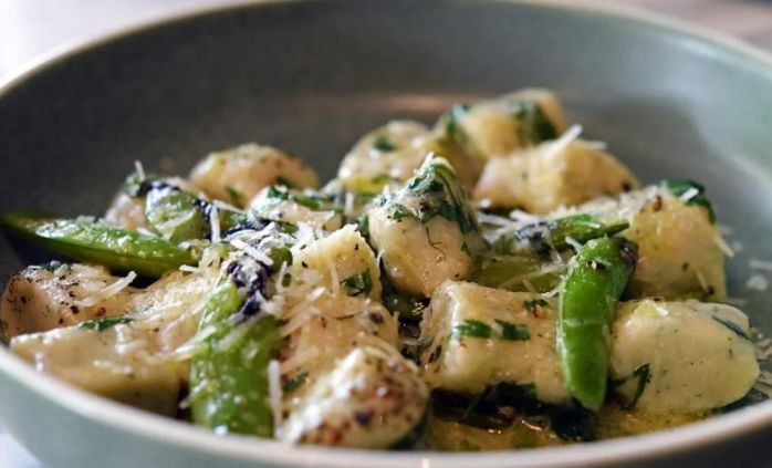 这里的菜单是地中海风格的,蔬菜菜肴闪耀。一碗美味的奶油蛋上缀有豌豆,撒上绿色薄荷调味料,最后撒上新鲜的芥末。