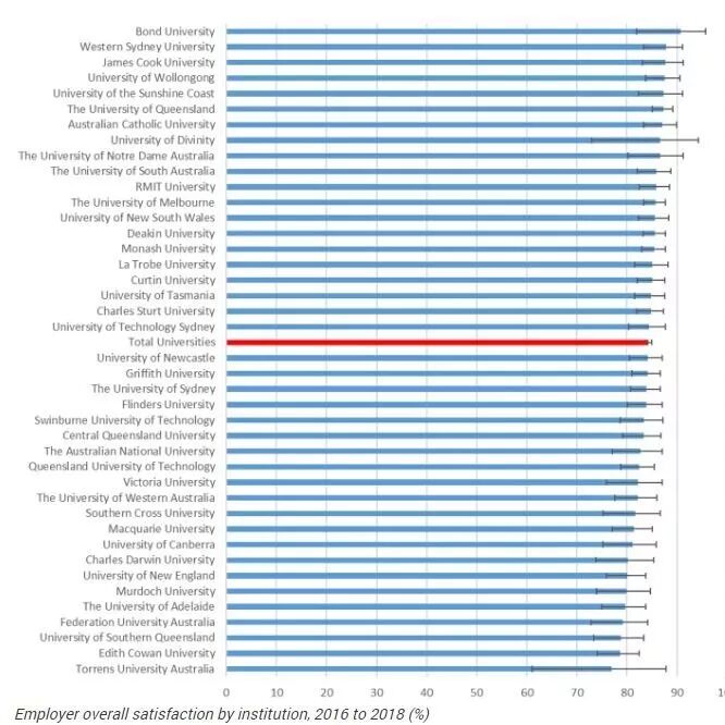 雇主对毕业生满意度最高的大学是位于黄金海岸的私立大学邦德大学,最不满意的也是一所私立大学–澳大利亚托伦斯大学。