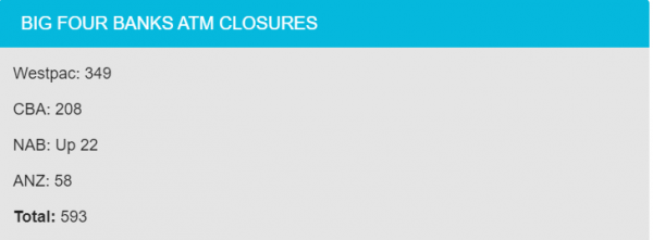 过去一年中四大行关闭的ATM数量(图片来源:GoldCoastBulletin)