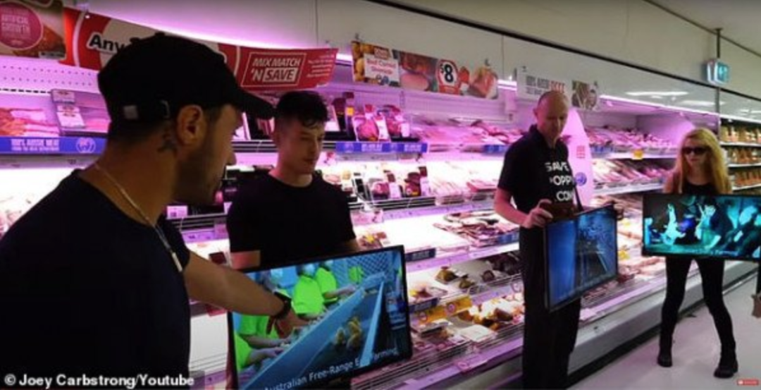 据悉,这些素食主义者身穿黑色上衣,手持电视,上面播放的是全澳各地屠宰场的画面。据Carbstrong周四分享至YouTube的视频显示,他指着电视屏幕,抨击购买肉、蛋及乳制品的顾客。