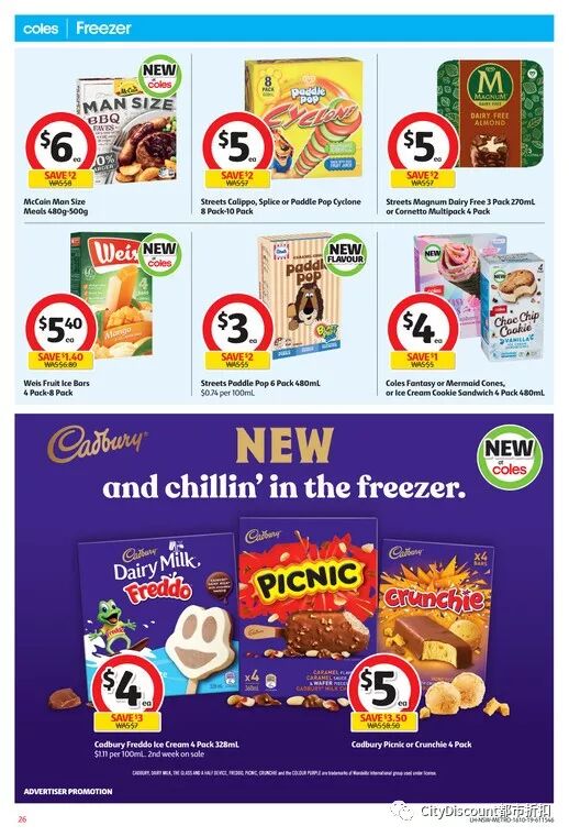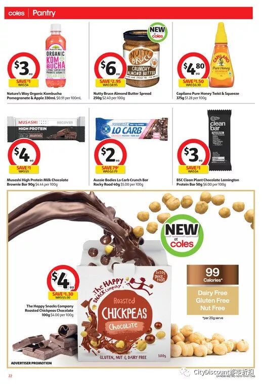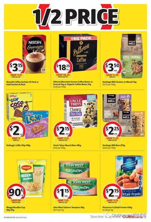 好吃的蔬菜干片,Bega花生酱,妙脆角,Thins薯片,可爱多蛋筒,24罐一箱可乐,指定雀巢速溶咖啡,Johnwest Tuna鱼罐头,Golden Fields 4L炒菜油,Up & Go,油炸春卷,Mr Chen yuncha饺子,Chobani酸奶等半价;