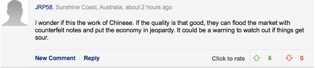 有网友表示:“我想知道这是不是中国人的杰作。如果假钞质量很高的话,它们非常可能会在市场里流通并使经济处于危险之中。这件事是个警告,要防止事情变得更糟。”