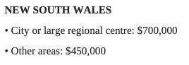 在新州,Sydney、Wollongong 、 Illawarra area、 Newcastle 和 Lake Macquarie的房屋只有不高于70万才能申请,而新州其他地区的房屋价格上限为45万