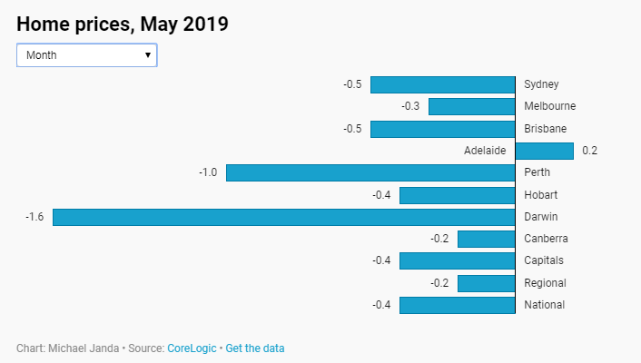 • CoreLogic最新的月度房屋价值指数显示,5月份房价平均下跌0.4%,偏远地区下降0.2%。