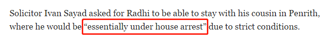 Radhi在最近一次提审上,竟无理地向法官提出了“去和悉尼的堂兄共同居住的”保释申请,还表示“那里条件恶劣,实际上对我来说也是一种软禁”。