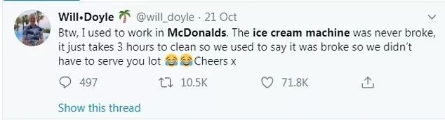 他在社交网站上写道:“顺便说一句,我曾经在麦当劳工作。冰激凌机其实从未损坏过,但需3个小时才可清洗干净,因此我们常说它‘已损坏’,这样我们就不必为您提供很多冰激凌。谢谢。”